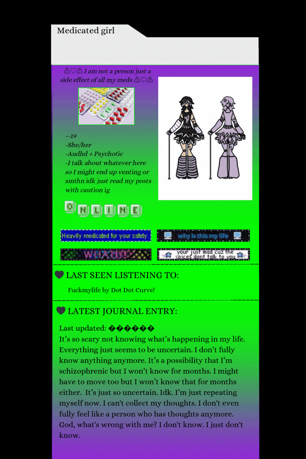 Medicated Girl was inspired by Weevildoing's album, the post-traumatic manifesto. It is about not knowing very important things in your life, and not feeling like you have any control.I made a TPTM-style profile for Medicated Girl
